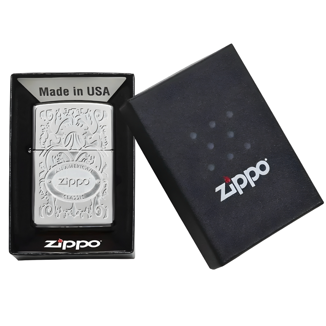 Având un design în filigran, această brichetă elegantă Zippo emană rafinament și calitate. Sigla Zippo este așezată cu atenție în partea de sus a capacului, iar designul sofisticat este creat folosind tehnologia de imprimare High Polish Chrome dual lucios. Vine într-o cutie cadou, ideală pentru a fi oferită în calitate de cadou. Construcția integrală din metal și mecanismul antivânt o fac un accesoriu de încredere în orice condiții. Bricheta este nealimentată și este proiectată să reziste mult timp. Ca întotdeauna, „clic” Zippo rămâne cartea de vizită constantă. Fabricată în SUA și susținută de o garanție pe viață.