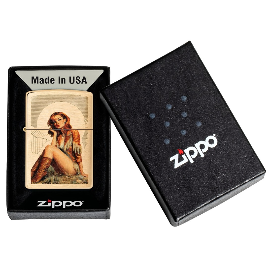 Această brichetă clasică Zippo din alamă mată este realizată în stil vintage Color Image și este decorată cu un desen vibrant al unei fete cowboy în stil pin-up. Designul atrage privirea prin atmosfera retro și detaliile vii, transformând accesoriul într-un obiect stilat și original. Bricheta are un corp metalic integral și este echipată cu construcția windproof specifică Zippo, cu sunetul caracteristic „clic”, asigurând funcționarea fiabilă aproape în orice condiții. Modelul este reutilizabil și conceput pentru o durată lungă de viață. Fabricată în SUA, se livrează într-o cutie cadou și beneficiază de garanție pe viață. Pentru performanță optimă se recomandă utilizarea combustibilului, pietrelor și fitilelor originale Zippo.