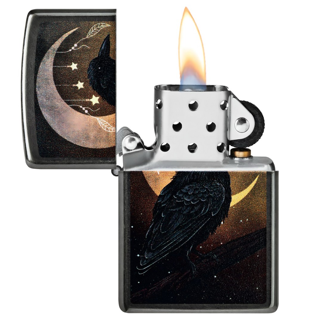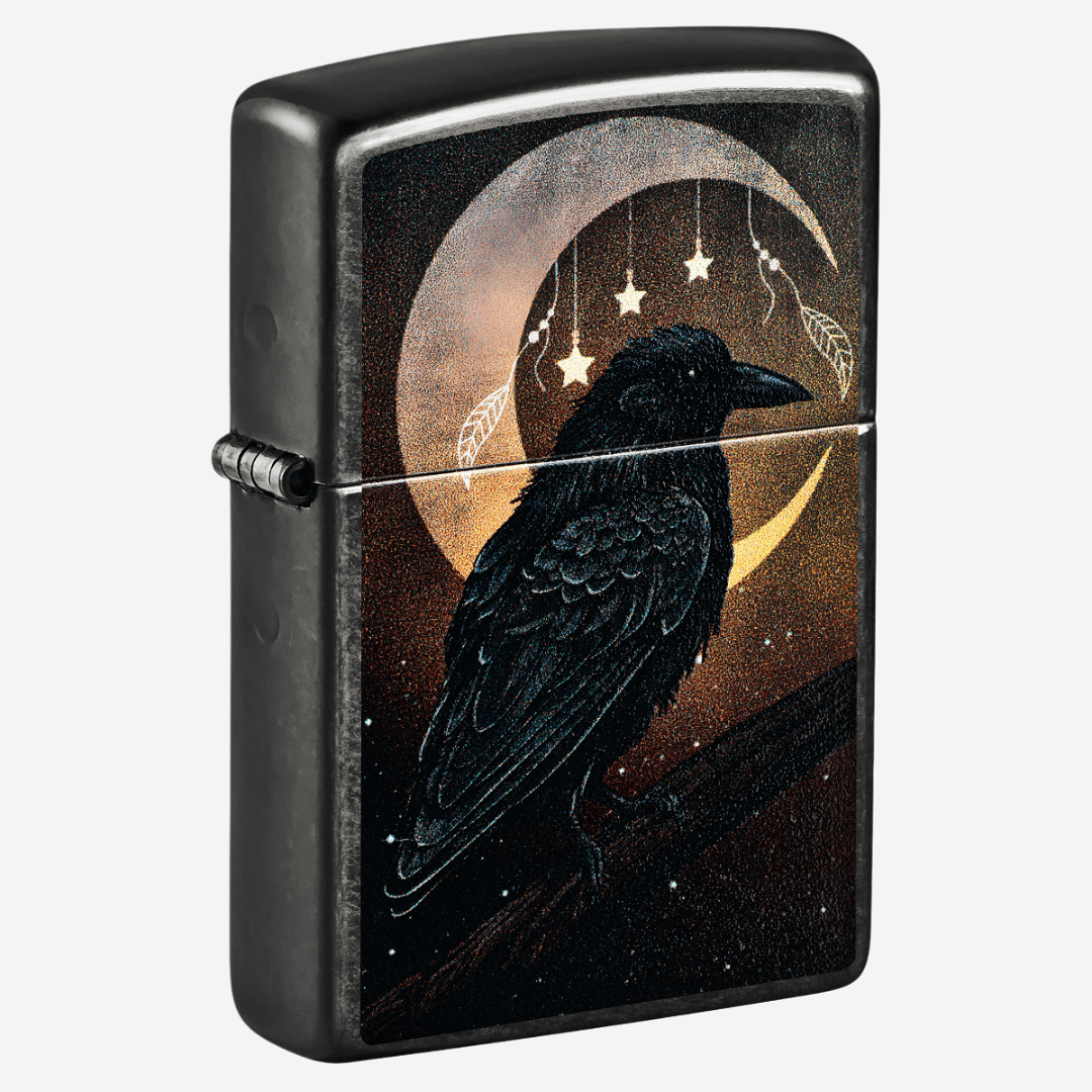 Această brichetă clasică Zippo de culoare gri este decorată cu un design de poveste realizat în tehnica Color Image. Pe carcasă este ilustrat un corb misterios, așezat sub o semilună strălucitoare, creând o atmosferă de mister și magie nocturnă. Compoziția artistică oferă accesoriului un caracter expresiv și ușor mistic. Bricheta este realizată dintr-un corp metalic solid și este echipată cu construcția windproof specifică Zippo, cu sunetul caracteristic „clic”, asigurând funcționarea fiabilă aproape în orice condiții. Modelul este reutilizabil și conceput pentru o durată lungă de viață. Fabricată în SUA, se livrează într-o cutie cadou și beneficiază de garanție pe viață. Pentru performanță optimă se recomandă utilizarea combustibilului, pietrelor și fitilelor originale Zippo.