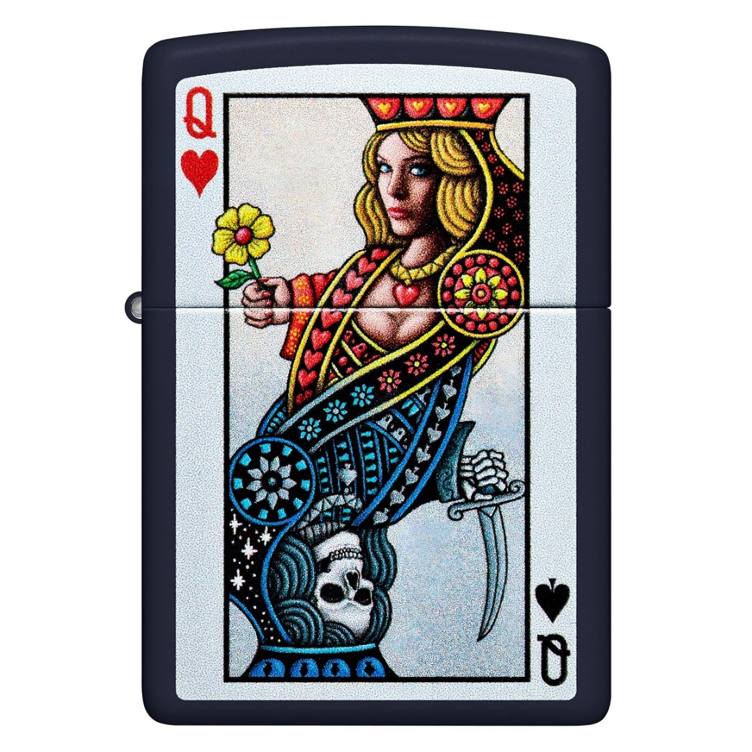 Pe această brichetă elegantă Zippo Navy Matte, două regine stau maiestuos una lângă alta, ca într-un duel etern, întruchipat în designul Color Image. Designul yin-yang este inspirat de simbolismul cărților de joc, oferind brichetei un aspect misterios și elegant. Ambalată într-o cutie cadou, această brichetă va fi un cadou de neuitat sau un plus la colecția ta. Construcția integrală din metal și sistemul de protecție împotriva vântului Zippo asigură durabilitate în toate condițiile. Este recomandat să utilizați combustibil Zippo, crremene și fitiluri autentice pentru o durată lungă de viață. Fabricată în SUA și susținută de o garanție pe viață.