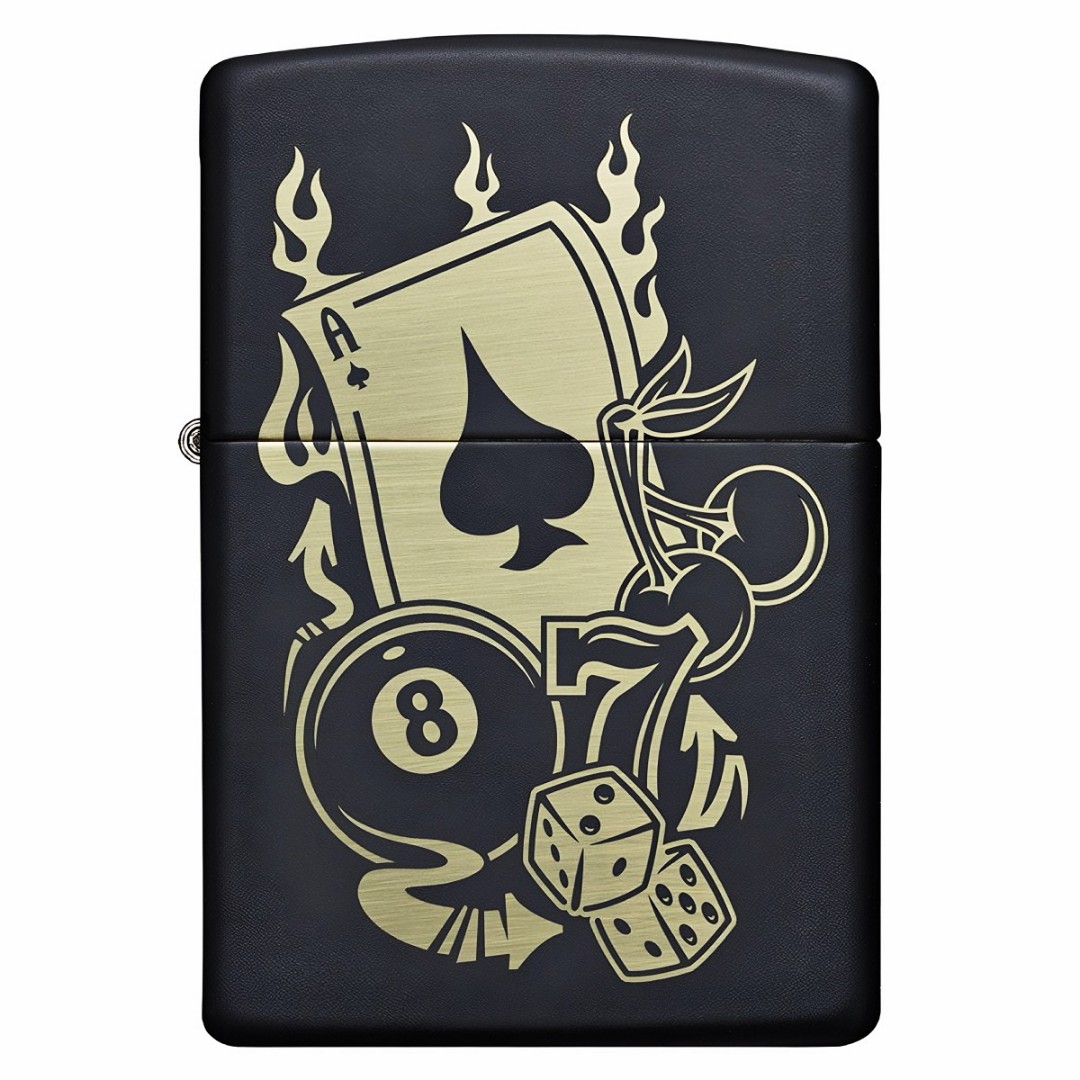 Această brichetă cu finisaj negru mat este un adevărat design de jocuri de noroc inspirat din lumea cazinourilor și a norocului. Gravura cu laser evidențiază multe elemente legate de jocurile de noroc, cum ar fi Asul de pică, numărul norocos 7, zarurile și multe altele. Acest design îi conferă brichetei un stil distinct și o face partenera ideală pentru excursiile în Sin City sau în orice alt loc unde norocul este util. Bricheta se vinde într-o cutie cadou Zippo și poate fi un cadou excelent pentru iubitorii de jocuri de noroc și accesorii elegante. Pentru a menține performanța optimă, se recomandă să alimentați bricheta cu combustibil Zippo.