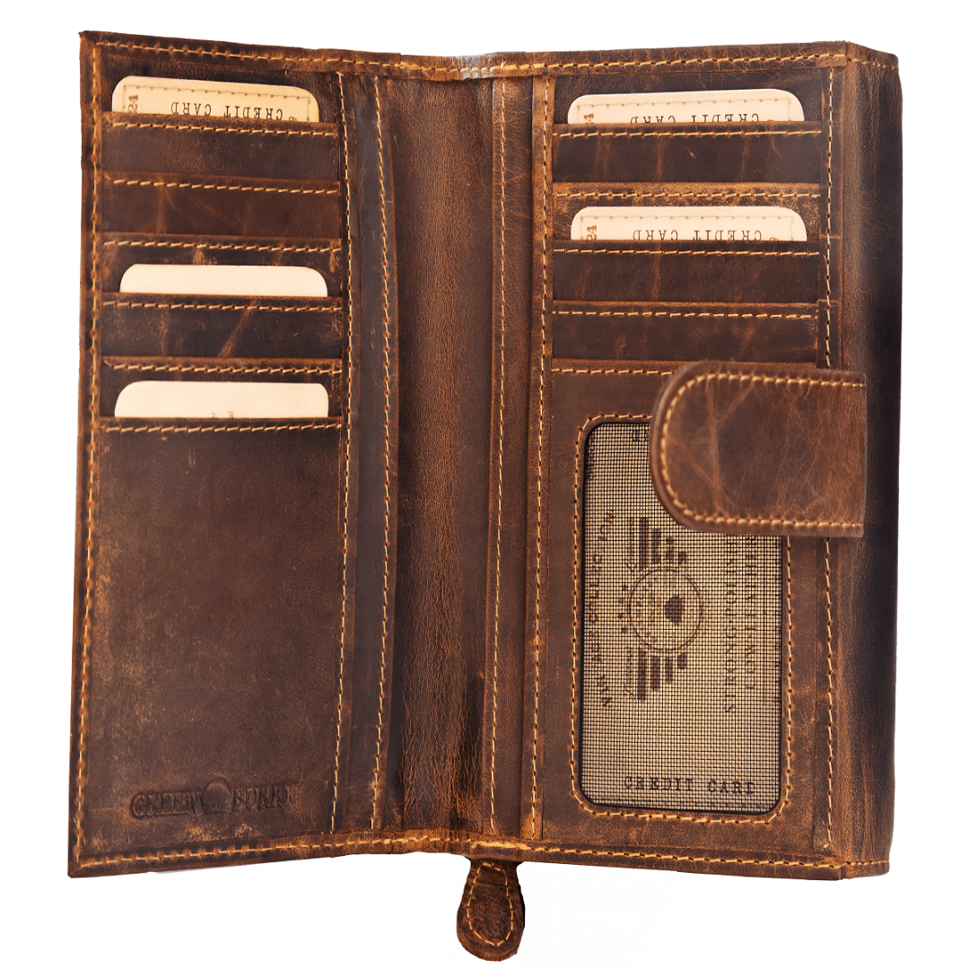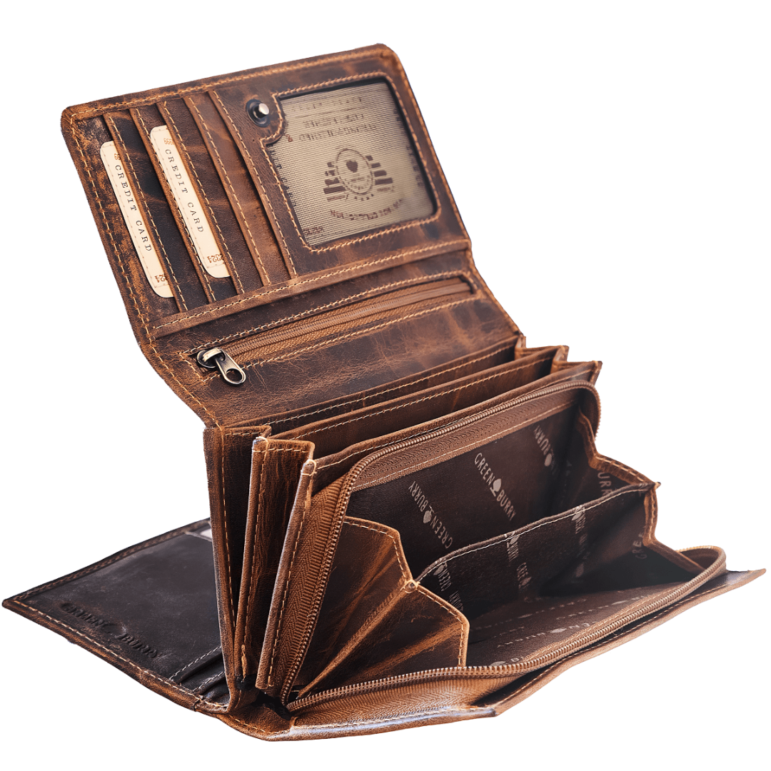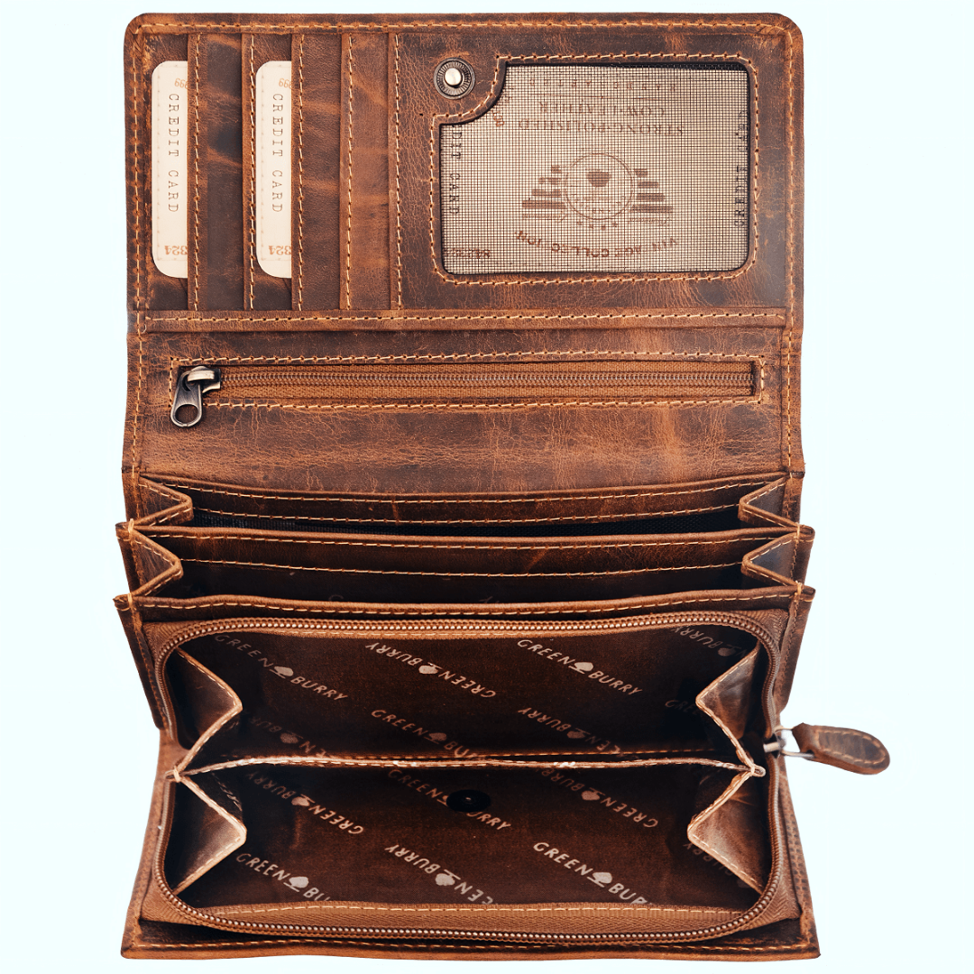 Portofelul din piele Greenburry, în culoarea maro antic „Vintage”, îmbină eleganța cu funcționalitatea și un stil clasic distinct. Realizat din piele naturală, acesta devine un companion de încredere pentru utilizarea zilnică, subliniind gustul și personalitatea purtătorului. Organizarea interioară bine gândită include 14 compartimente pentru carduri, trei ferestre pentru acte de identitate sau fotografii, buzunare interioare spațioase pentru chitanțe și documente, precum și două compartimente pentru bancnote. Buzunarul separat pentru monede, cu fermoar și două compartimente, permite păstrarea ordonată și accesul rapid la mărunțiș, iar clapeta cu închidere pe capsă oferă un plus de siguranță. Acest portofel este alegerea ideală pentru cei care apreciază confortul, ordinea și estetica vintage în accesoriile de zi cu zi.