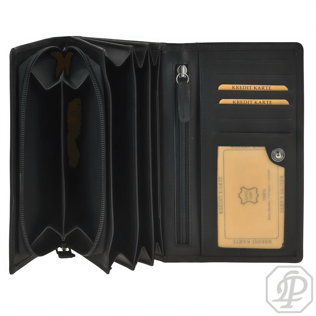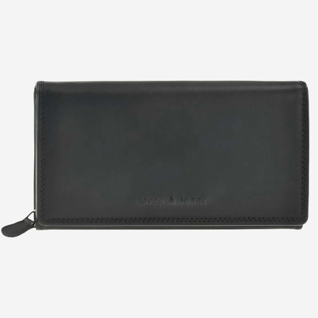 Portofelul de damă Greenburry RFID "Newport" este creat pentru femeile care apreciază calitatea, eleganța și siguranța într-un singur accesoriu. Realizat din piele naturală de capră, ușor cerată, într-o nuanță clasică neagră, acesta impresionează prin textura sa moale și aspectul său nobil. Materialul este plăcut la atingere și rezistent, păstrându-și frumusețea de-a lungul timpului. Interiorul bine organizat oferă tot ce este necesar pentru utilizarea zilnică: opt sloturi pentru carduri, patru buzunare suplimentare, un compartiment cu fereastră transparentă și un separator practic pentru documente sau bancnote. Două compartimente cu fermoar asigură spațiu suplimentar și siguranță sporită pentru obiectele personale. Un avantaj esențial al acestui model este protecția RFID integrată, care împiedică citirea neautorizată a datelor personale. Elegant și funcțional, portofelul Greenburry "Newport" este un companion de încredere pentru fiecare zi, combinând designul modern cu funcționalitatea și calitatea premium.