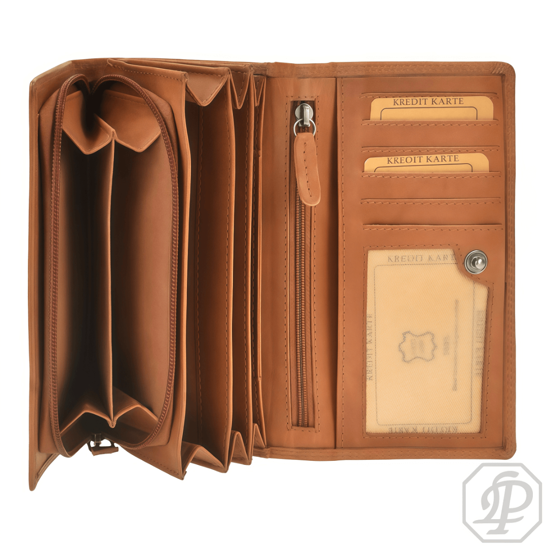 Portofelul de damă Greenburry RFID "Newport" este creat pentru femeile care apreciază calitatea, eleganța și siguranța într-un singur accesoriu. Realizat din piele naturală de capră, ușor cerată, într-o nuanță caldă de caramel, acesta impresionează prin textura sa moale și aspectul său nobil. Materialul este plăcut la atingere și rezistent, păstrându-și frumusețea de-a lungul timpului. Interiorul bine organizat oferă tot ce este necesar pentru utilizarea zilnică: opt sloturi pentru carduri, patru buzunare suplimentare, un compartiment cu fereastră transparentă și un separator practic pentru documente sau bancnote. Două compartimente cu fermoar asigură spațiu suplimentar și siguranță sporită pentru obiectele personale. Un avantaj esențial al acestui model este protecția RFID integrată, care împiedică citirea neautorizată a datelor personale. Elegant și funcțional, portofelul Greenburry "Newport" este un companion de încredere pentru fiecare zi, combinând designul modern cu funcționalitatea și calitatea premium.