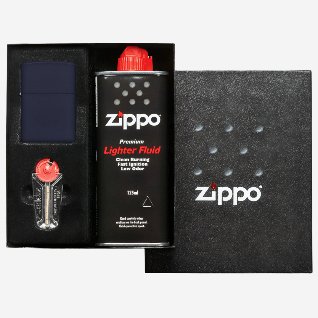 Подарочный набор Zippo Classic Navy Blue Matte — идеальный выбор для тех, кто ценит качество, надежность и классический стиль. В набор входит синяя зажигалка с матовой поверхностью, известная своим простым, но элегантным дизайном. Эта зажигалка имеет ветрозащитную конструкцию. Зажигалка продается в подарочной коробке, и мы рекомендуем заправлять ее оригинальным топливом Zippo для оптимальной работы. Она имеет характерный щелчок Zippo при открытии и закрытии крышки и может использоваться многократно. Произведено в США и имеет пожизненную гарантию.