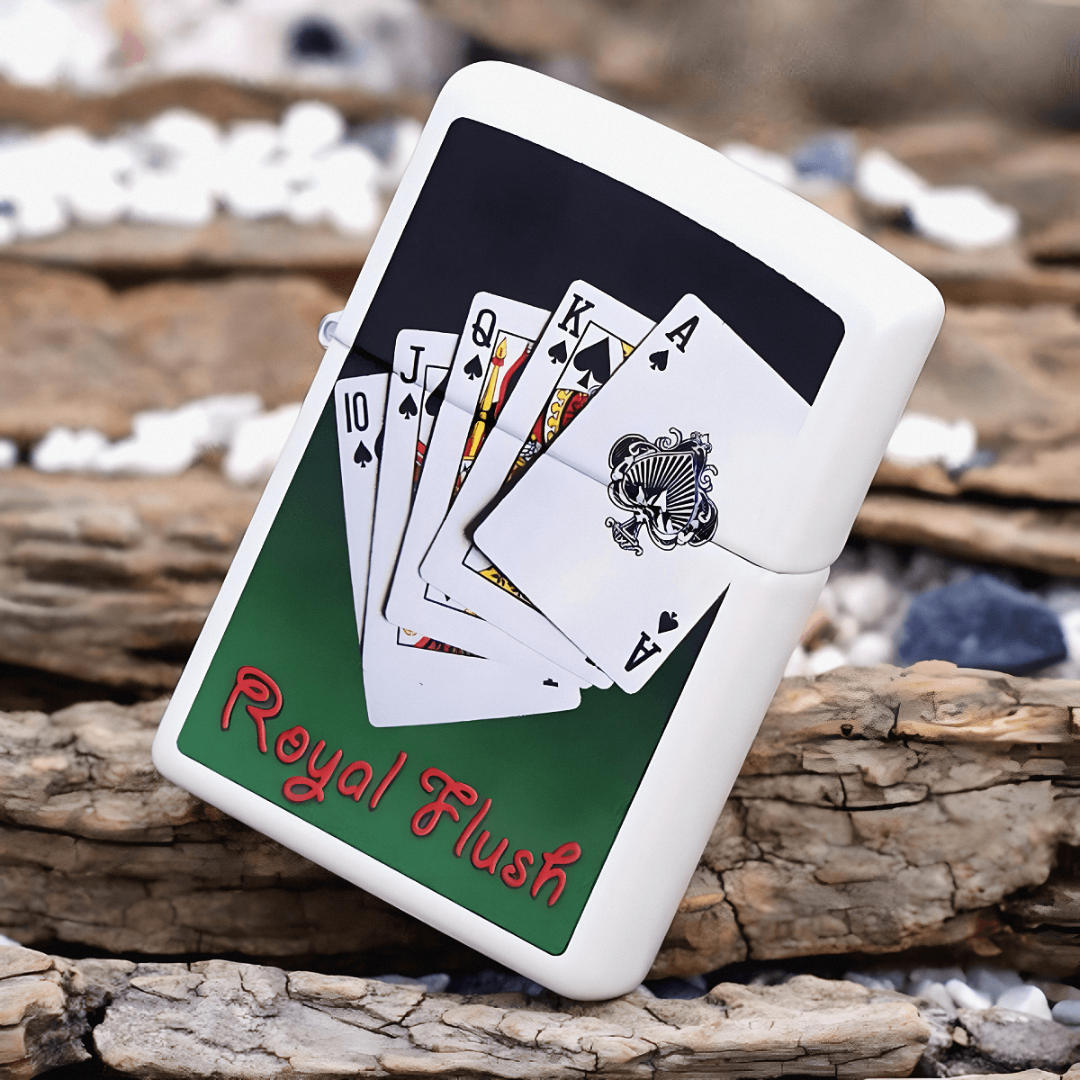 Зажигалка Zippo Royal Flush 28038 214 — это элегантный и выразительный аксессуар, созданный для ценителей азартных игр и коллекционеров стильных предметов. Корпус выполнен из прочного металла с покрытием матового белого цвета, приятного на ощупь и устойчивого к износу. На лицевой стороне изображена эффектная композиция — пять белых игральных карт, составляющих комбинацию Royal Flush (самая сильная комбинация в покере), расположенные на глубоком зелёном фоне, напоминающем поверхность игрового стола. Контраст между белым матовым корпусом и насыщенным рисунком создаёт гармоничное и современное впечатление. Узнаваемый щелчок крышки остаётся неотъемлемой частью стиля Zippo. Модель заправляется бензином и рассчитана на многолетнее использование, а для безупречной работы рекомендуется применять оригинальное топливо, кремни и фитили Zippo. Изготовленная в США, эта зажигалка сочетает культовый дизайн, практичность и пожизненную гарантию качества. Она поставляется в фирменной подарочной коробке и станет достойным аксессуаром как для коллекции, так и для ежедневного использования.