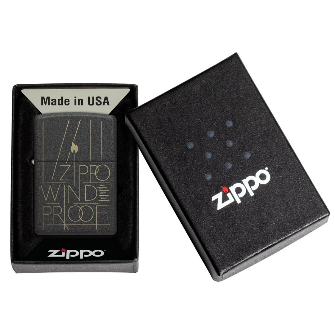 Эта классическая зажигалка Black Crackle® украшена современным лазерным гравированием с надписью «Zippo Windproof», расположенной среди чётких графических линий и дополненной символом пламени Zippo. Зажигалка поставляется в подарочной коробке. Это оригинальная ветрозащитная модель Zippo с характерным металлическим щелчком. Прочная металлическая конструкция устойчива к внешним условиям, а ветрозащитный дизайн обеспечивает надёжную работу практически в любых условиях. Зажигалка многоразовая и рассчитана на длительное использование. Для оптимальной работы рекомендуется использовать оригинальное топливо, кремни и фитили Zippo. Сделана в США с пожизненной гарантией.