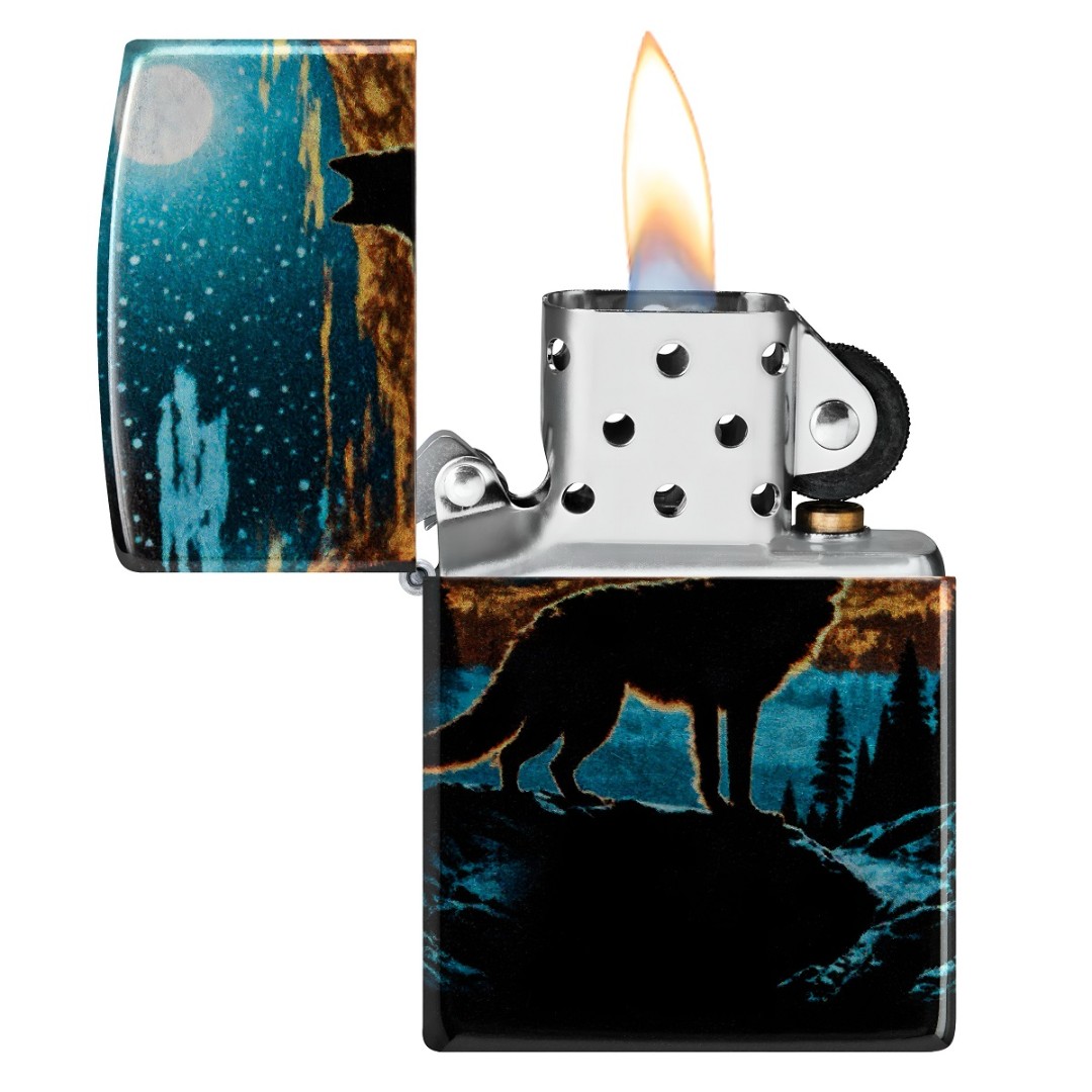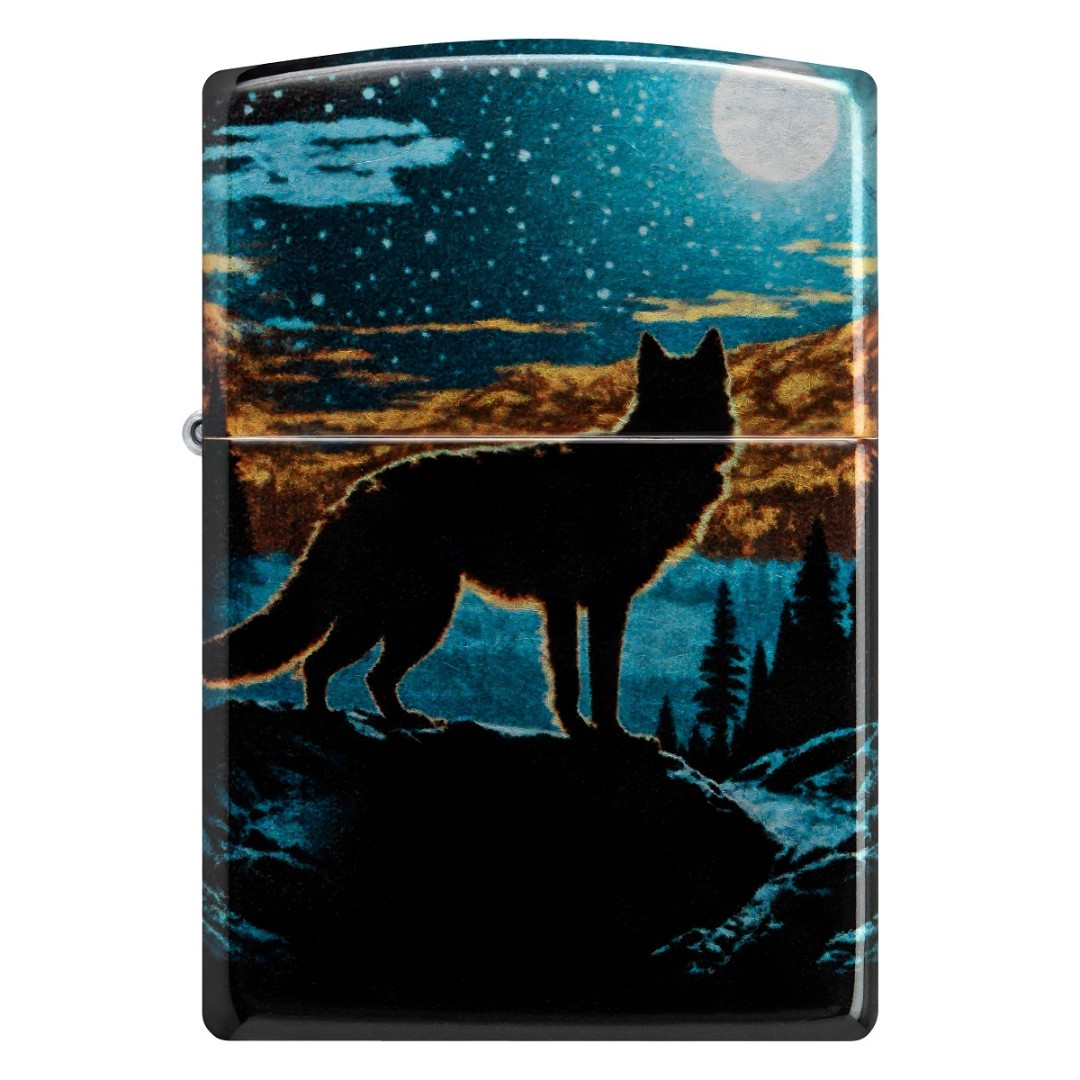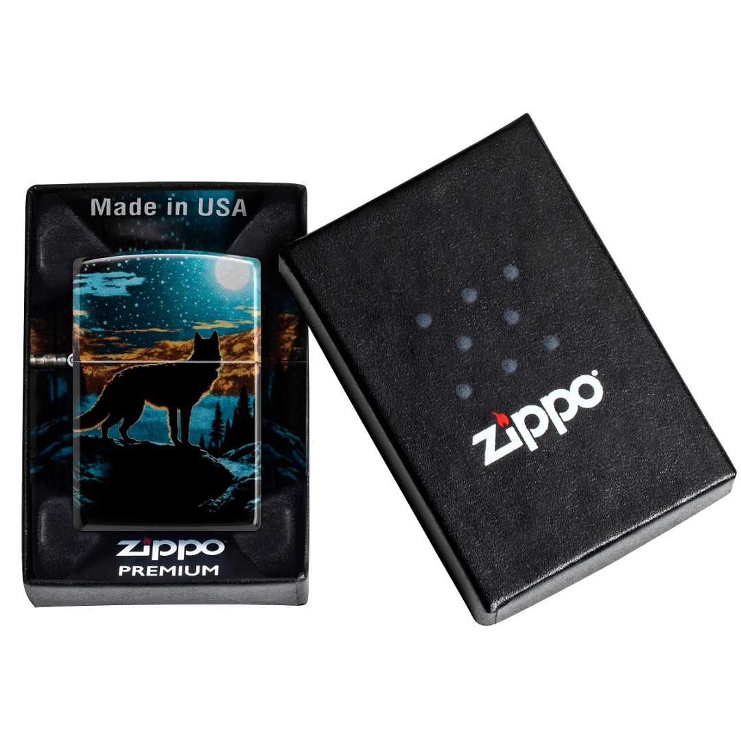 На классической зажигалке Zippo Moonlight Wolf Design с хромированной отделкой и выразительным дизайном 540 Fusion изображён одинокий волк, созерцающий залитый лунным светом пейзаж. Глубокие оттенки и плавные линии создают атмосферу тишины и силы природы. Модель поставляется в подарочной коробке и работает на фирменном топливе Zippo, обеспечивая стабильное пламя. Это оригинальная ветрозащитная зажигалка Zippo с фирменным щелчком и полностью металлической конструкцией, рассчитанная на многолетнее использование. Произведено в США и обеспечено пожизненной гарантией — настоящее качество, проверенное временем.