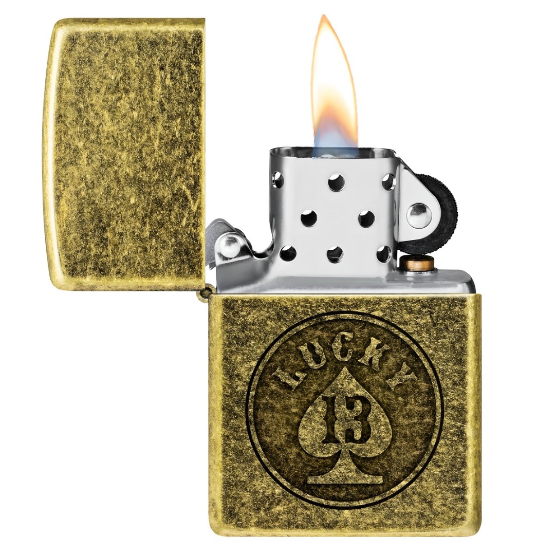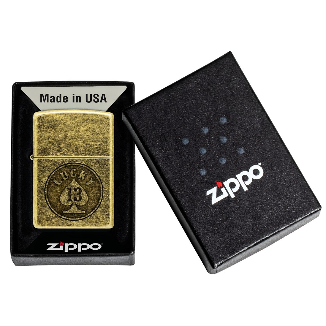 Эта классическая зажигалка Zippo из античной латуни украшена лаконичным и выразительным дизайном, выполненным с использованием технологии Lustre. На её поверхности выгравирован символ пикового туза с надписью «Счастливая 13», придающий аксессуару атмосферу удачи, азарта и индивидуального стиля. Зажигалка выполнена в прочном цельнометаллическом корпусе и оснащена фирменной ветрозащитной конструкцией Zippo с характерным щелчком, что обеспечивает надёжную работу практически в любых условиях. Модель многоразовая и рассчитана на долгий срок службы. Производится в США, поставляется в подарочной коробке и сопровождается пожизненной гарантией. Для оптимальной работы рекомендуется использовать оригинальное топливо, кремни и фитили Zippo.