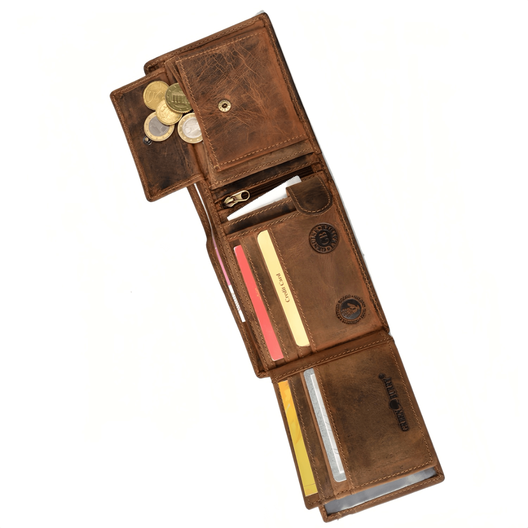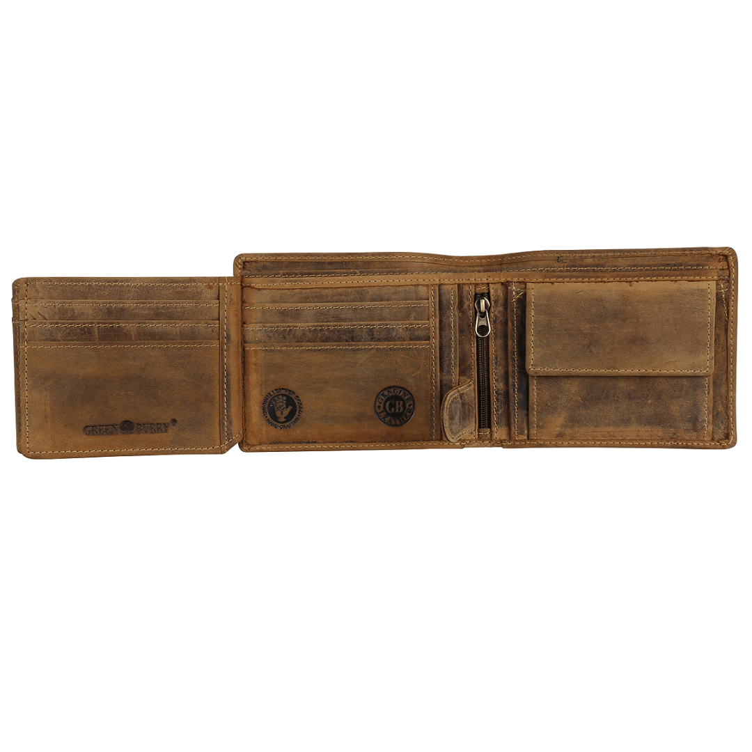 Мужской кошелек Greenburry из натуральной коровьей кожи станет настоящим украшением для каждого мужчины. Этот кошелек является одной из самых важных вещей, которую мужчина всегда носит с собой наряду с мобильным телефоном и ключами от машины. В античном коричневом цвете, он представляет собой уникальную вещь, которая производит элегантное впечатление благодаря натуральной шлифованной коровьей коже. Кошелек имеет размеры 12,5 см в ширину, 10,5 см в высоту и 3,0 см в глубину, что позволяет ему идеально помещаться в карман брюк, не будучи слишком громоздким. Весом всего 125 грамм, он легок и удобен для повседневного использования. Семь просторных отделений для карт обеспечивают достаточно места для хранения различных карт. Два отделения для купюр предназначены для хранения банкнот. Два защитных отделения на молнии идеально подходят для хранения важных документов или больших сумм наличных. Три дополнительных кармана и три отделения со смотровыми окнами вместе с отделением для мелочи делают этот кошелек крайне функциональным. Этот кожаный кошелек предоставляет много места для всевозможных вещей, связанных с платежными операциями, и станет исключительным аксессуаром для исключительного человека.