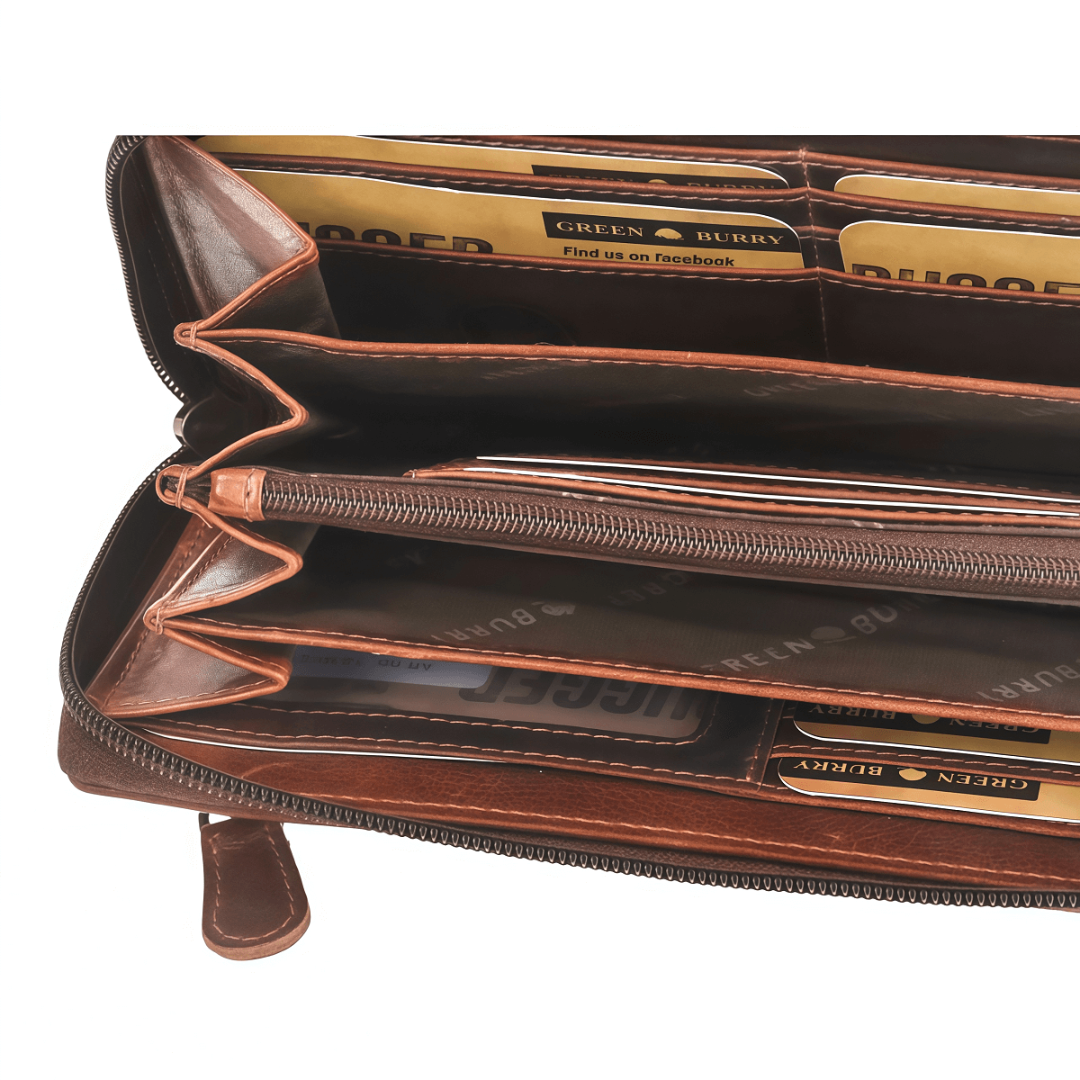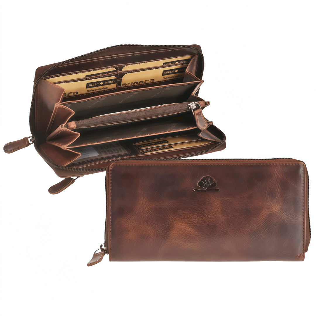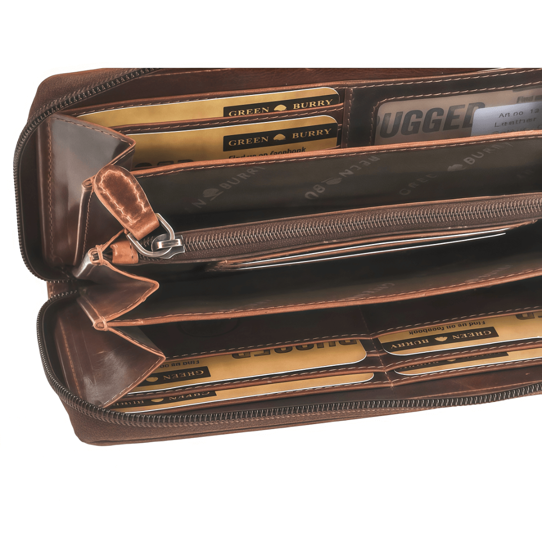 Кожаное портмоне унисекс Greenburry "Rugged" с размерами 19×10 см выполнено из натуральной зернистой кожи тиково-коричневого цвета, обработанной маслами и воском. Со временем оно приобретает уникальную патину, подчеркивающую характер изделия. Портмоне оснащено круговой молнией и RFID-защитой которая предотвращает нежелательное считывание личных данных Внутри — четыре секции для купюр и мелочи, двенадцать слотов для карт, два прозрачных отсека, четыре кармана и два кармана на молнии. Элегантный тисненый логотип завершает дизайн, делая портмоне не только практичным, но и стильным аксессуаром, который будет служить долгие годы.
