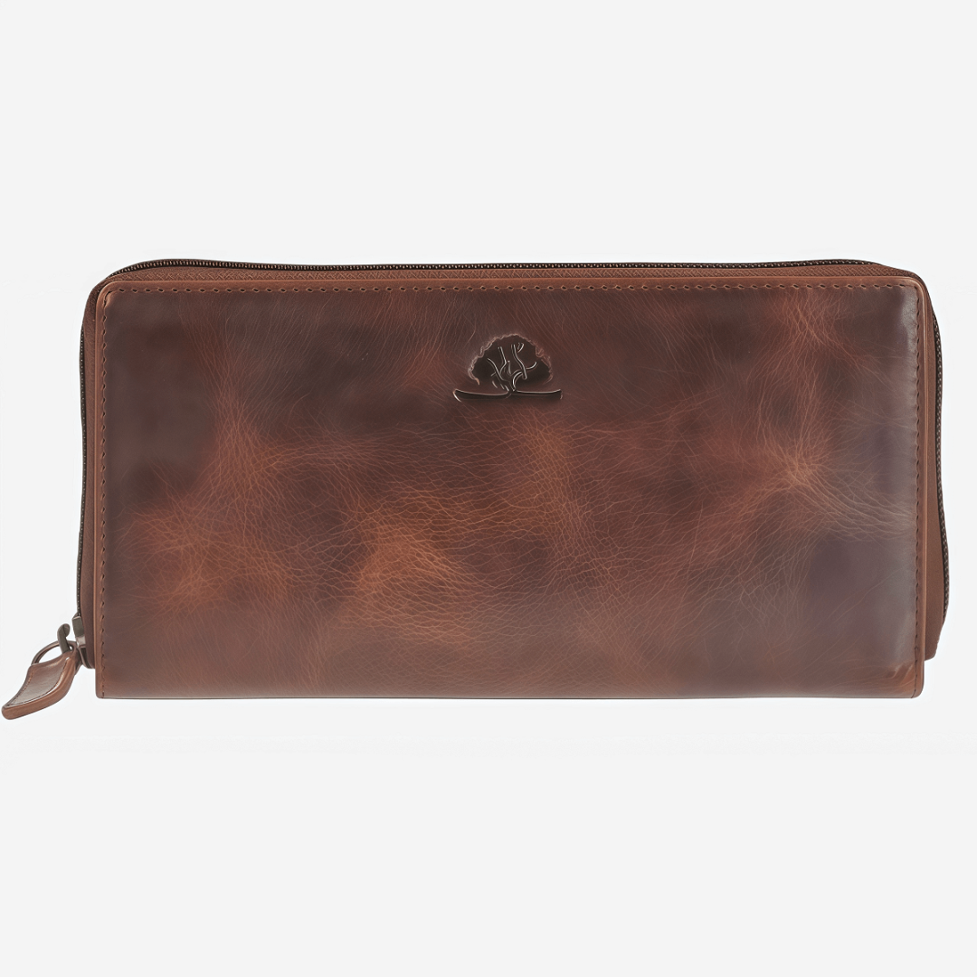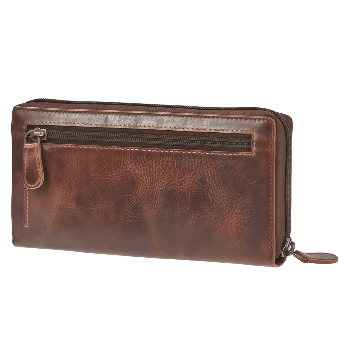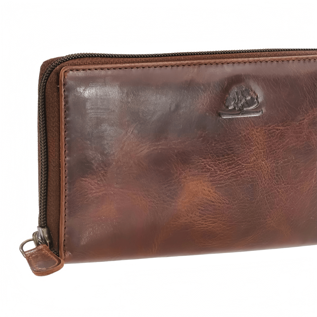 Кожаное портмоне унисекс Greenburry "Rugged" с размерами 19×10 см выполнено из натуральной зернистой кожи тиково-коричневого цвета, обработанной маслами и воском. Со временем оно приобретает уникальную патину, подчеркивающую характер изделия. Портмоне оснащено круговой молнией и RFID-защитой которая предотвращает нежелательное считывание личных данных Внутри — четыре секции для купюр и мелочи, двенадцать слотов для карт, два прозрачных отсека, четыре кармана и два кармана на молнии. Элегантный тисненый логотип завершает дизайн, делая портмоне не только практичным, но и стильным аксессуаром, который будет служить долгие годы.