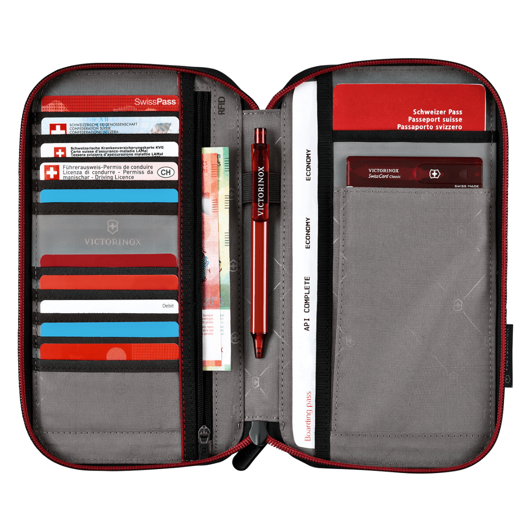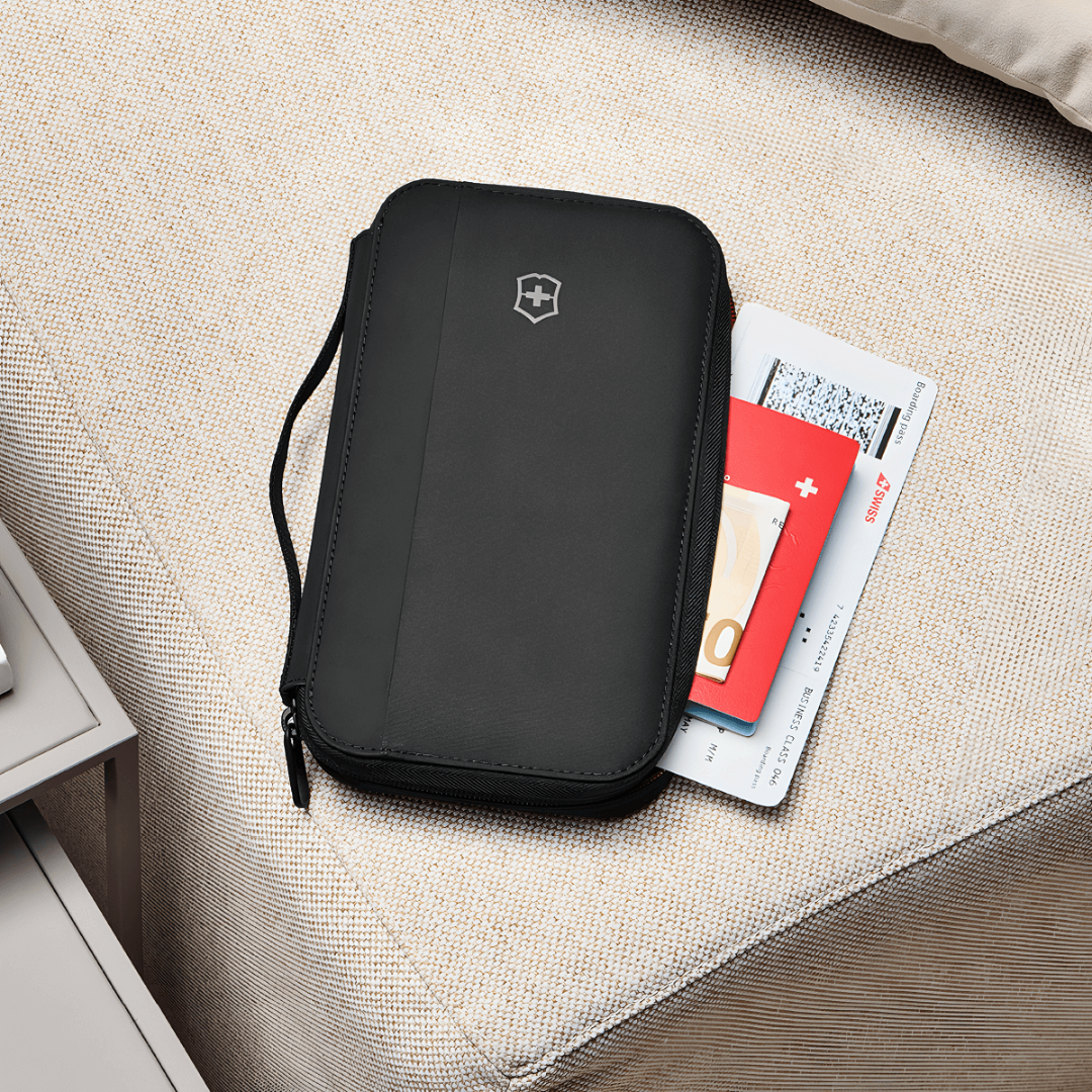 Органайзер для путешествий Victorinox Travel Essentials создан для того, чтобы сделать ваши поездки максимально удобными и безопасными. Он позволяет хранить карты, документы и ценные вещи в одном месте, поддерживая идеальный порядок. Встроенная защита от RFID-сканирования надежно оберегает личные данные, а антимикробная подкладка препятствует росту микроорганизмов, обеспечивая чистоту и гигиену. Благодаря продуманной системе отделений — 10 слотам для карт, карману на молнии, держателю для ручки и нескольким внутренним карманам — все необходимое всегда под рукой. Доступен в черном и светло-сером цветах, сочетая функциональность с элегантным стилем.