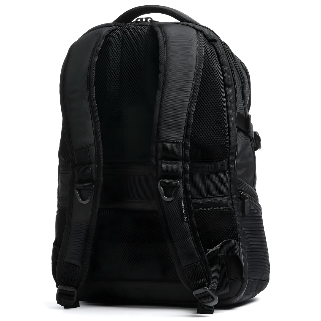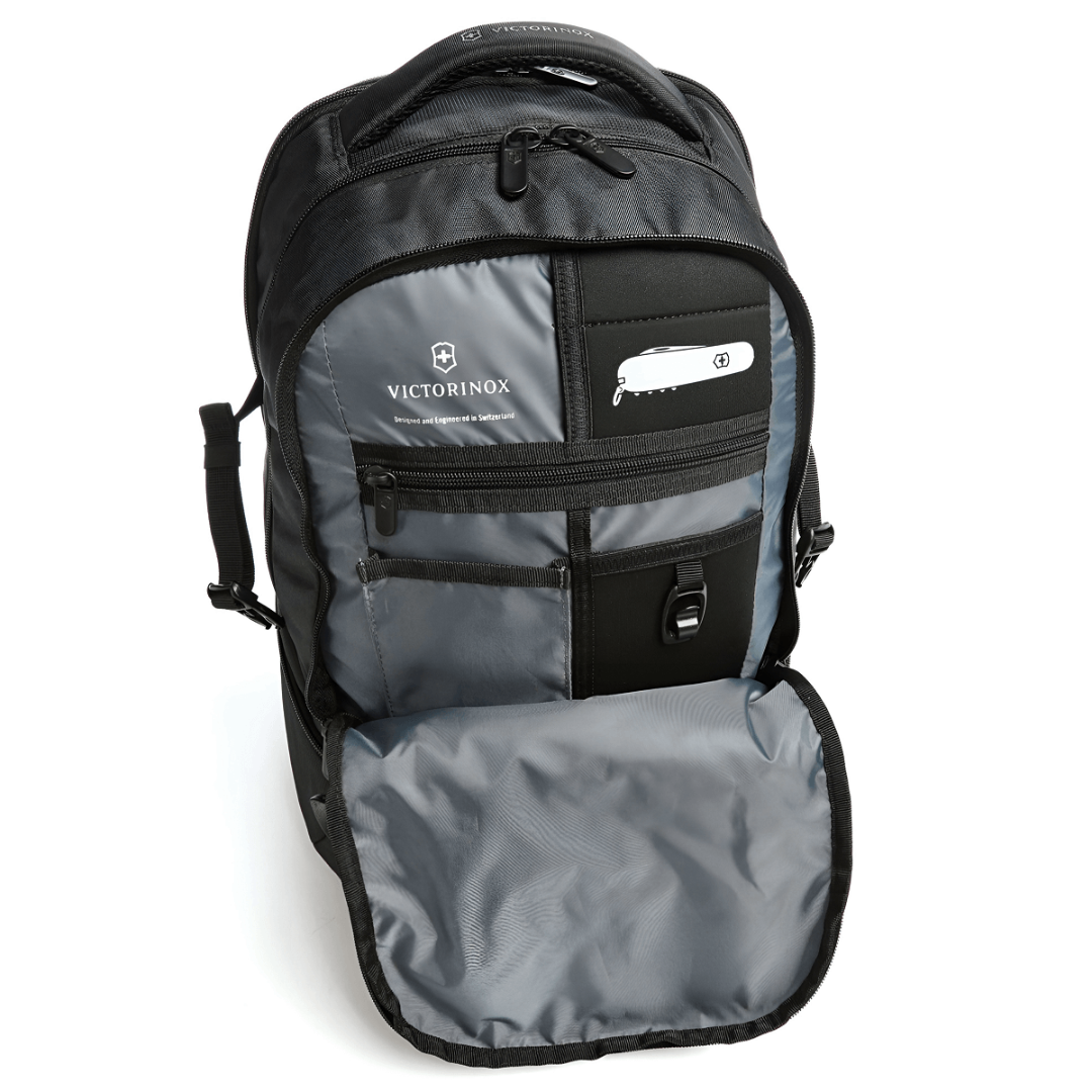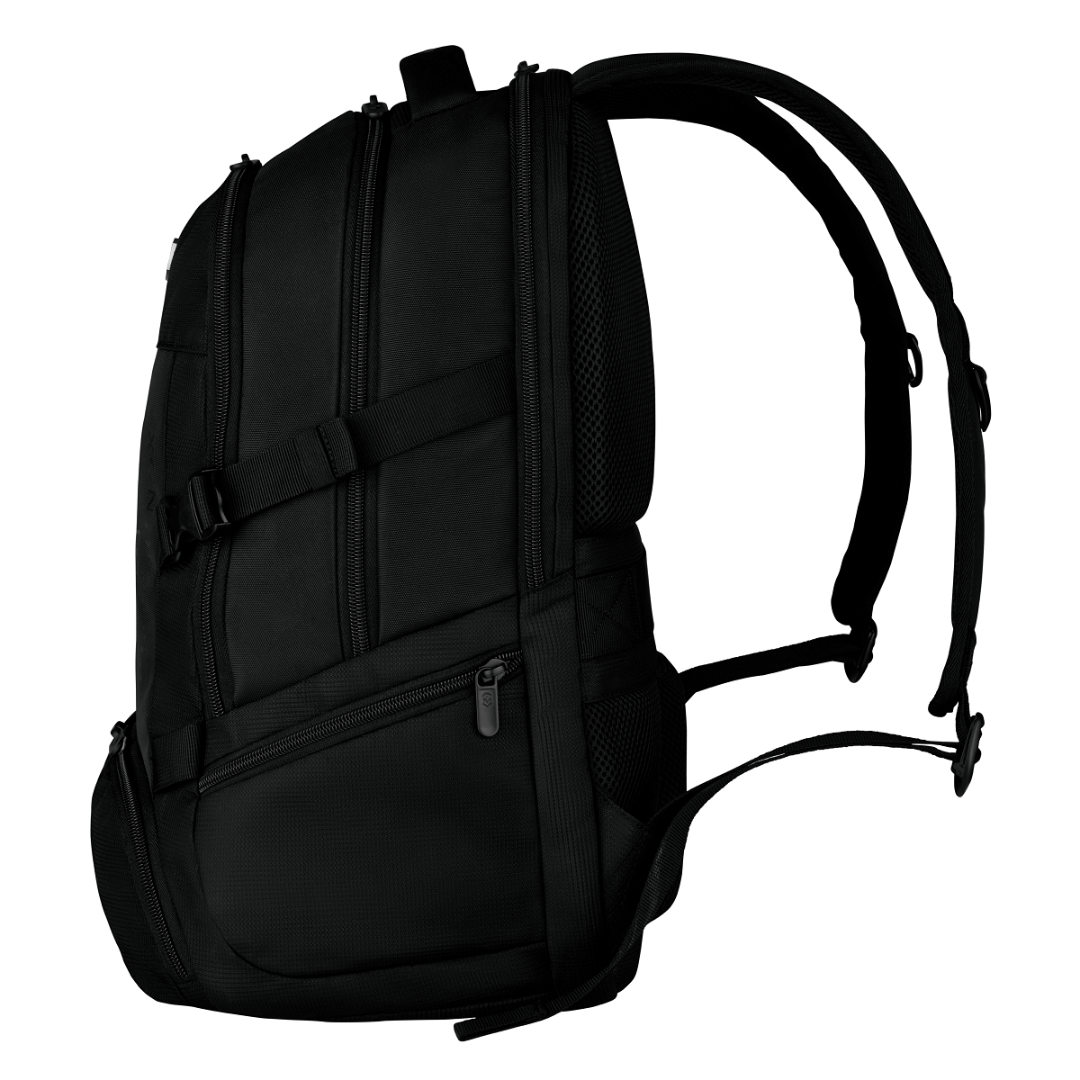 Рюкзак VX Sport EVO Deluxe создан для тех, кто ценит надежность, комфорт и продуманную организацию пространства. Он выполнен из прочного полиэстера и оснащен многофункциональным отделением для безопасного хранения техники и повседневных вещей. Мягкая, дышащая спинка с вентиляционными каналами и регулируемые плечевые лямки обеспечивают высокий уровень комфорта даже при длительном ношении. Рюкзак предлагает удобную систему организации с фронтальным карманом на молнии, двумя боковыми карманами, компрессионными ремнями и ремнем для крепления на тележке. Двусторонняя молния с возможностью блокировки повышает защиту от кражи, а металлическая фурнитура антрацитового цвета и фирменный крест со щитом Victorinox подчеркивают качество и стиль.