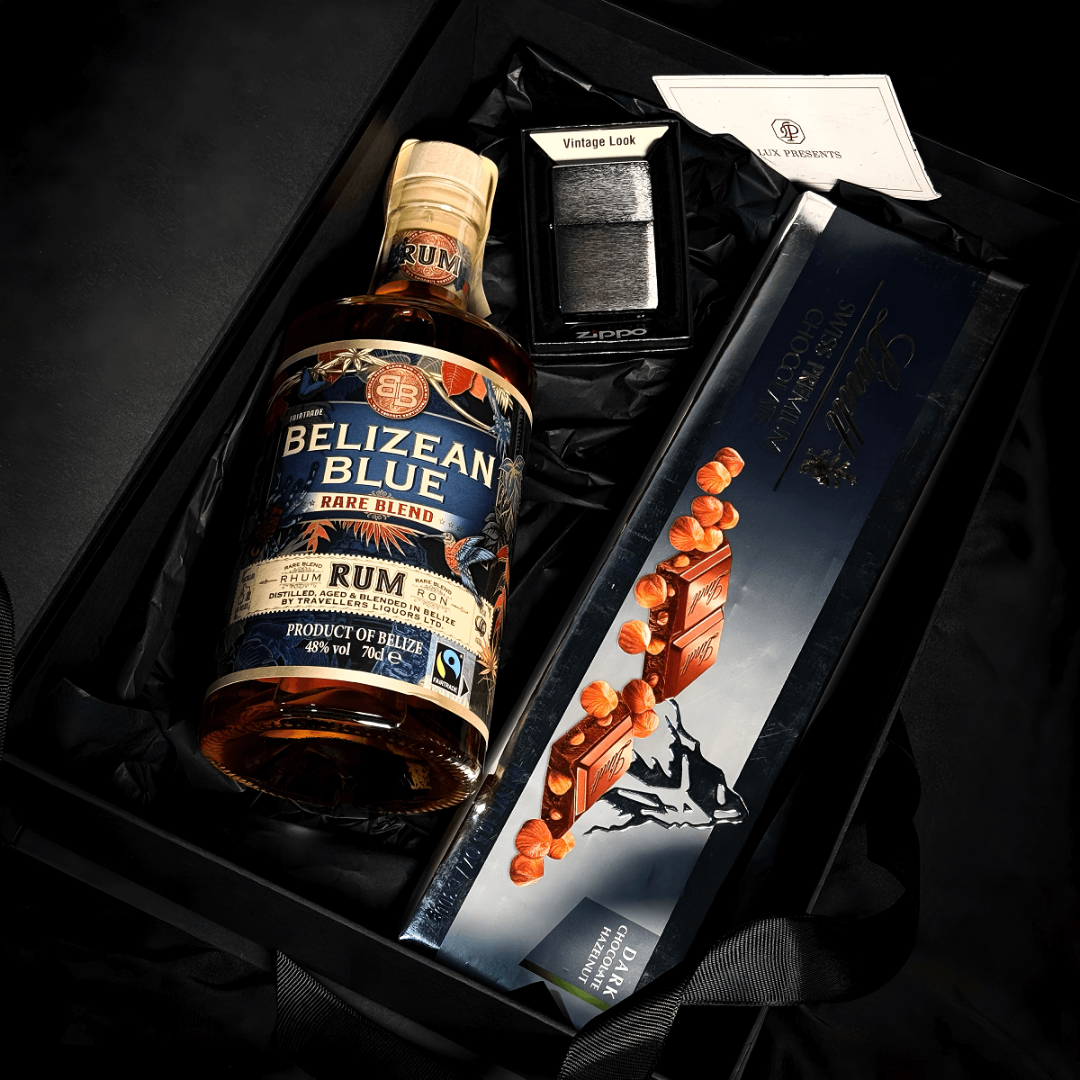 Gift Box Belizean Blue Rare + Lindt Silver Dark Hazelnut + Zippo