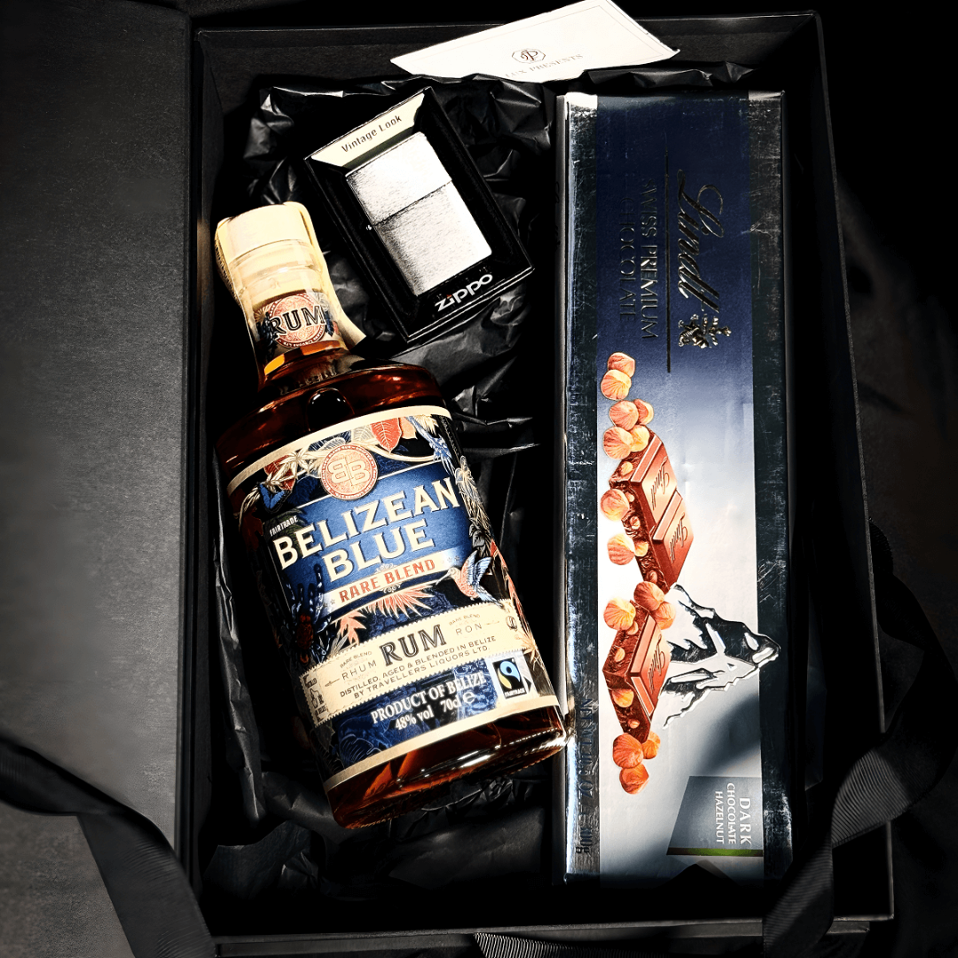Gift Box Belizean Blue Rare + Lindt Silver Dark Hazelnut + Zippo